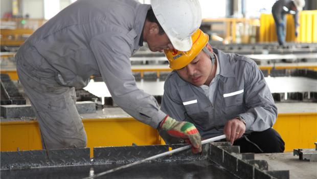 夏天的裝配式生產(chǎn)車間高溫難耐,生產(chǎn)經(jīng)理在和工人囑咐生產(chǎn)要點