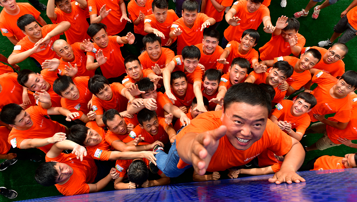 團建中,在經歷一次失敗后,全體新員工終于成功翻越畢業墻