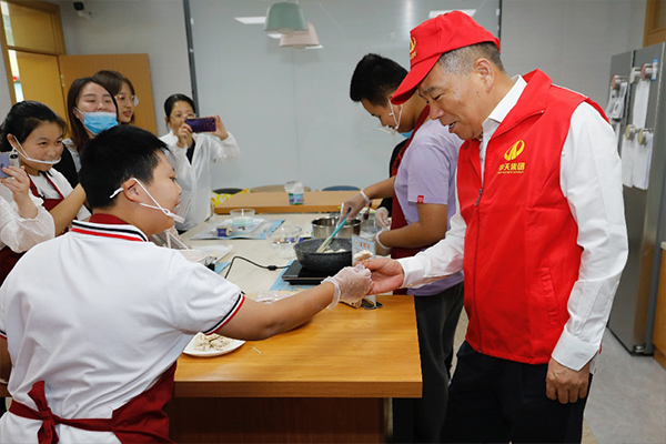 在杭州市艮山路學校的教室里,金世豪集團董事長樓永良大手牽小手,耐心地鼓勵孩子們完成一份份手工糕點。